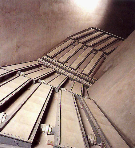 E型排列(见图5)适用于各种规格的水泥或生料储存库和搅拌库,环形区充气箱向中心区倾斜安装,中心区充气箱水平安装。